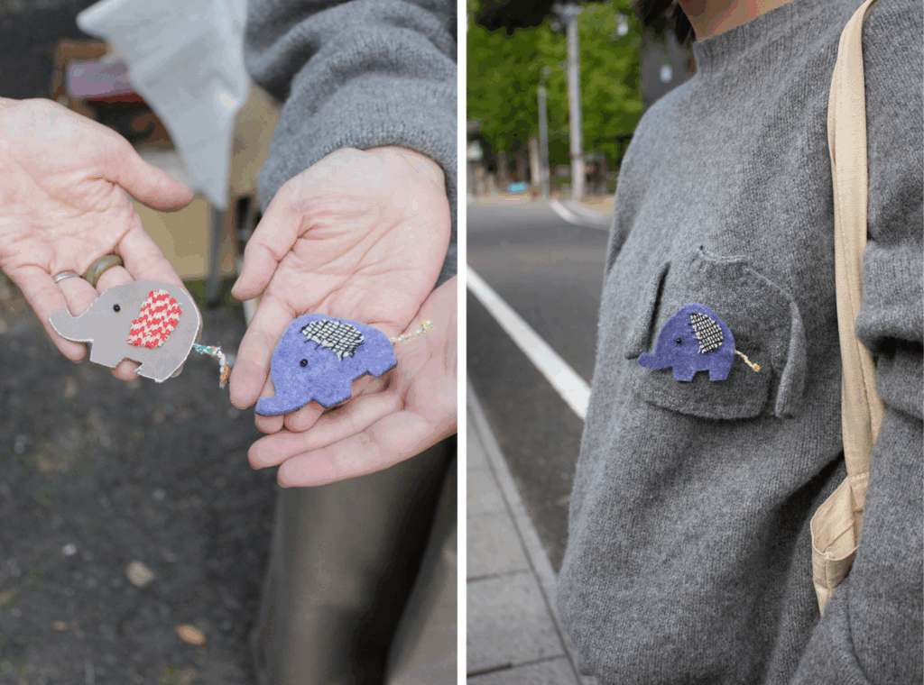 布や糸を組み合わせてオリジナルのブローチを作るワークショップ。ゾウの耳の部分にラッセル編みの生地を使用。早速、身につけてひつじサミットを満喫する友人たち!