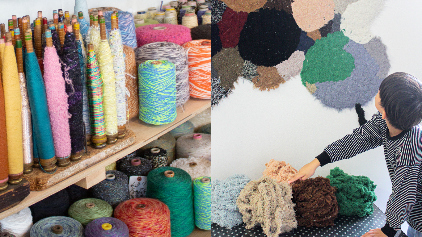 高級メゾンブランドなどでも取り扱われる美しい生地サンプルがずらりと並ぶショールームの入り口には、生地の織りの工程で通常であれば廃棄されてしまう切れ端をアップサイクルしたanimaformaのラグが展示されている。