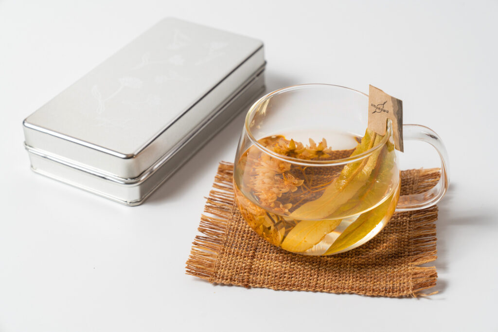山形で「和リンデン」とも呼ばれる「しなの木」の花を、わずか8日間の開花期間中にひとつひとつ手摘みしてドライハーブにした、うむのわ(umunowa)の「しなの花ティー」。花をカットせずホールのまま乾燥させており、お湯を注ぐとカップの中で花が開き、まるで水中花のように可憐な姿を楽しめる。