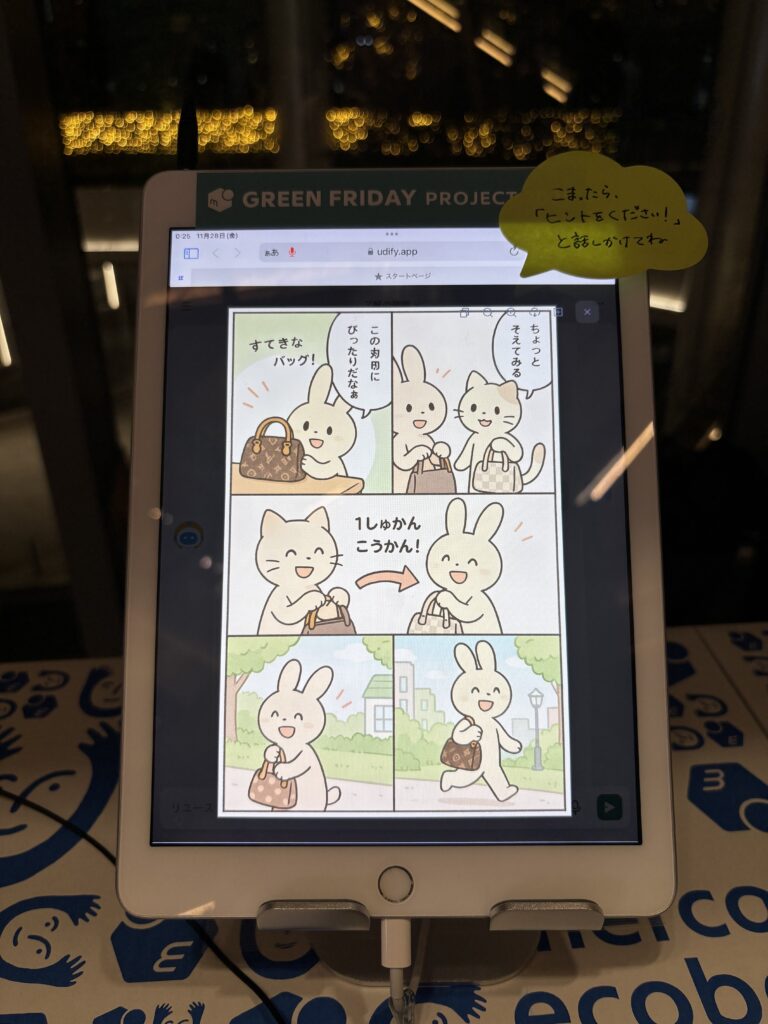 メルカリの研究開発組織「R4D」が展開する研究開発ネットワーク「メルカリR4Dラボ」が提供したAIが、明日からできるリユースアイディアを導き出してくれるサービス。タブレットを使って入力するもので、筆者はブランドバッグをどうしよう?と入れたところ、期間を決めて友達と交換してみては?と提案され、最後にそのストーリーが漫画(!!)で表示された。