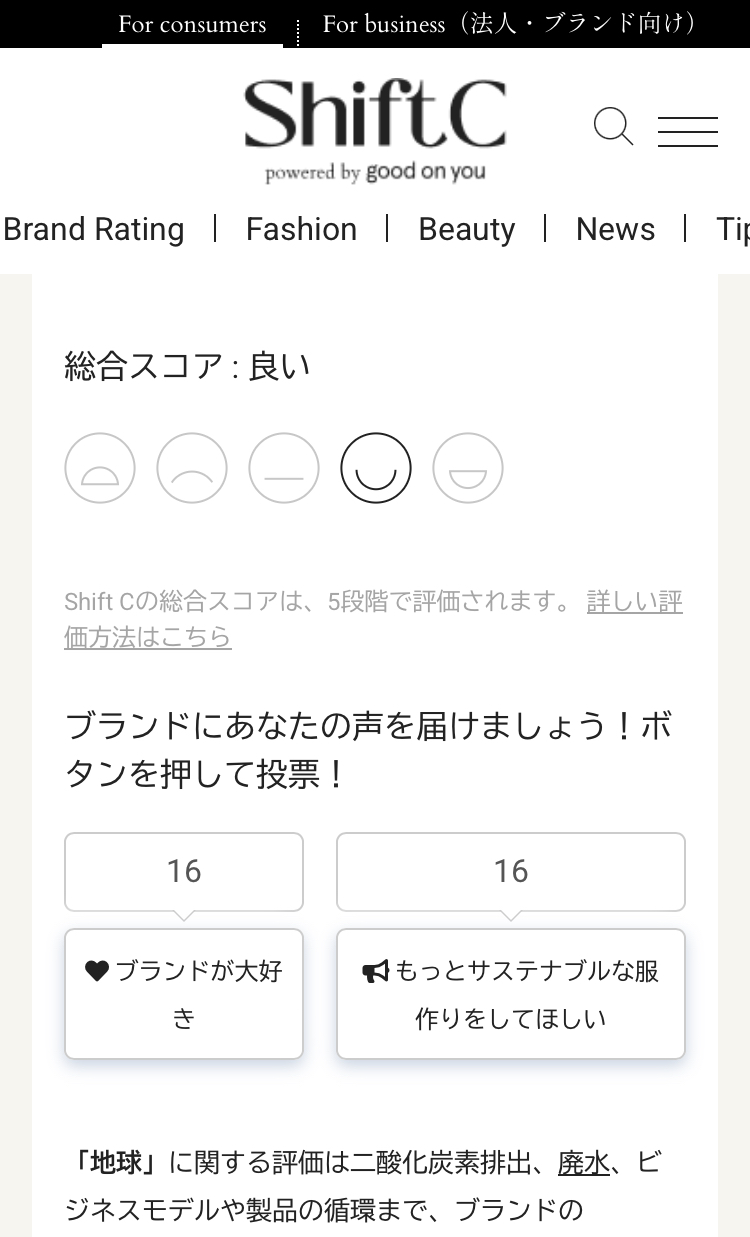 Shift Cでは、あなたの声をブランドに伝える仕組みがある。気になるブランドを検索し、評価ページのボタンをワンプッシュするだけで、あなたの想いを届けることができる。
