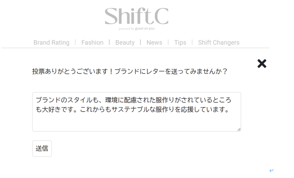 実際に、Shift Cでは、生活者の声をブランドへ届ける機能「ブランドレター」を2024年から設置しています。「サステナブルな取り組み内容をもっと知りたい!」など、ブランドに対して気軽に送れるのでぜひご活用ください😊