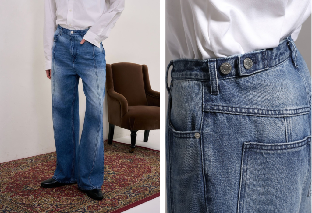 松井:素材や仕組みに加えて、サステナビリティは「仕様」にも落とし込めると感じています。たとえば、BLAYMOREのフレアデニムパンツには後ろ側にウエストアジャスターを付けていて、体型の変化に合わせて片側3センチずつ調整できるようにしています。