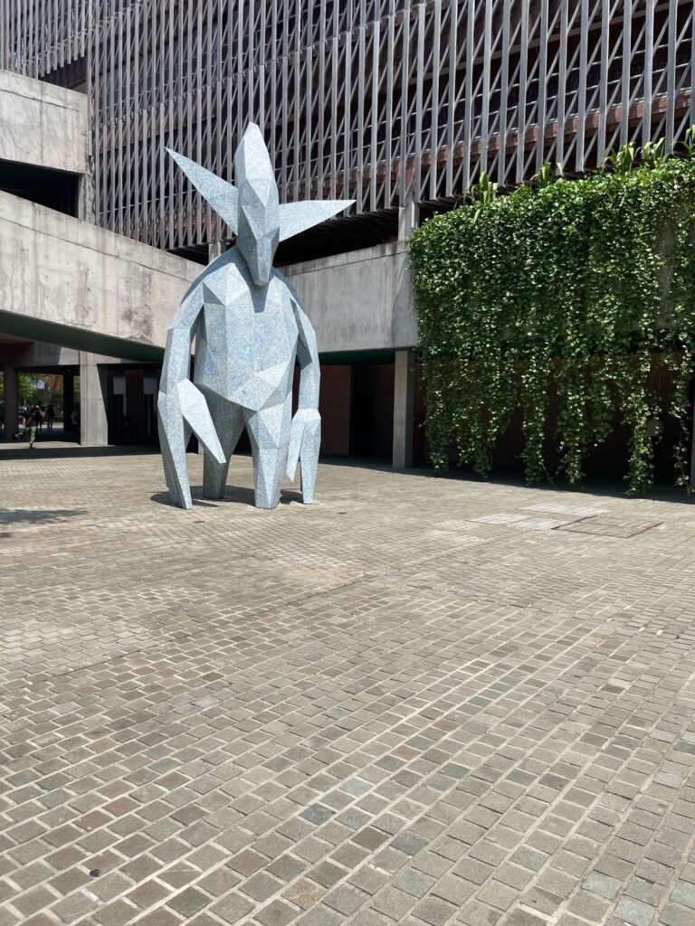 ポテトヘッドのサスティナビリティを象徴するのは、庭にあるアップサイクルされた素材でできたオブジェ。Futuraという有名な現代アーティストの作品