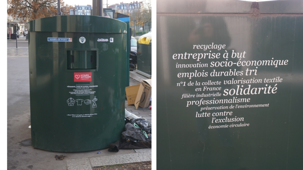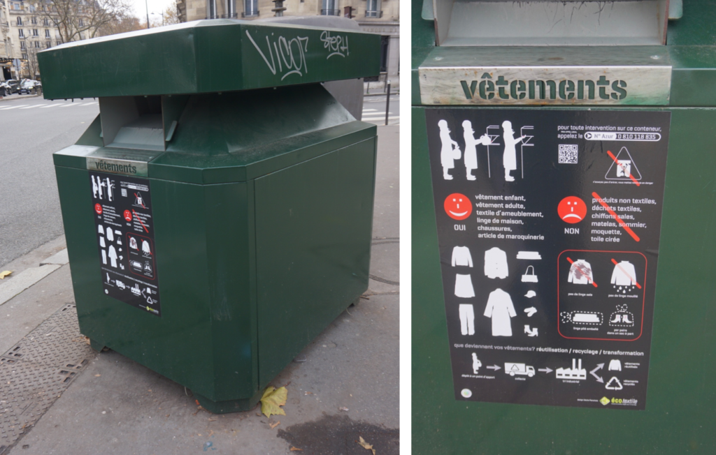 フランスの街中には、全土で47,000点の回収ボックスが設置されています(写真下)。日常の動線の中で目に入る場所に置かれており、不要になった衣類を袋に入れて投函するだけで回収に出すことができます。特別な手続きや費用は必要なく、生活の延長線上に回収ボックスがあります。