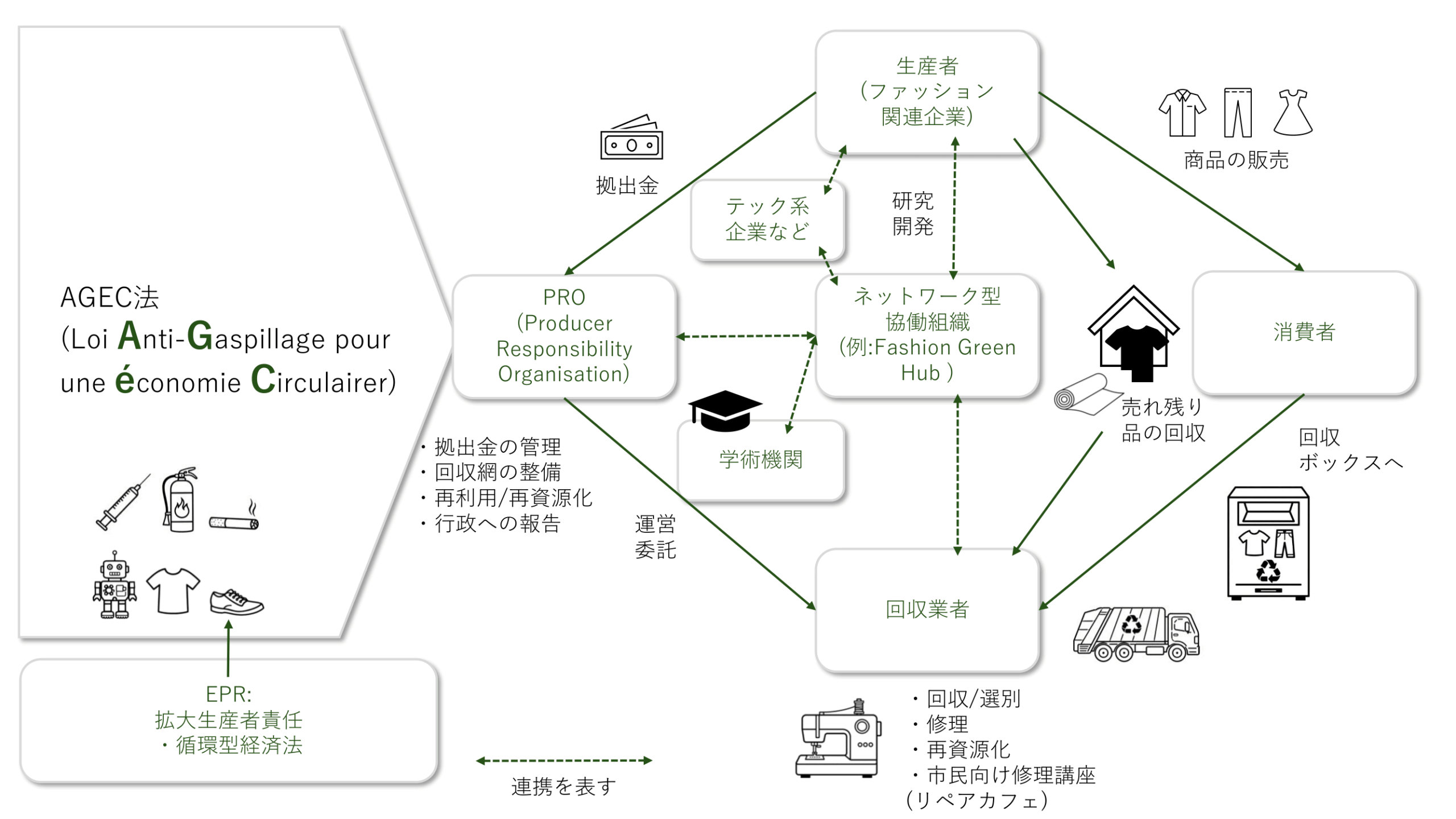 衣類分野では、Refashionという組織がPRO(生産者責任組織)として指定され、生産者に代わって回収や再利用、リサイクルの実務を担っています。本稿でいう「衣類廃棄禁止法令」とは、AGEC法の中でも、とくにこの衣類分野のEPRの全体を指しています。