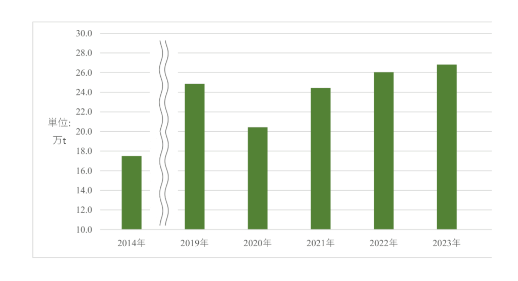 このような回収制度は「衣類廃棄禁止法令」を元に運営されています。この法令について出国前、日本の報道³ を読んだ際には、「回収量が増えすぎて、現場がうまく回っていないのではないか」という印象を持っていました。回収の制度を担うRefashionという政府認定の民間組織のデータや、実際に現地で関係者に話を聞くと、回収量が大幅に増えているのは事実です。Refashionによるデータを元にした回収量の推移(下)を見ると、衣類廃棄禁止法令の前身となる制度による2014年の回収量約17.5万tから、2024年には28.9万tと約1.7倍に増えています