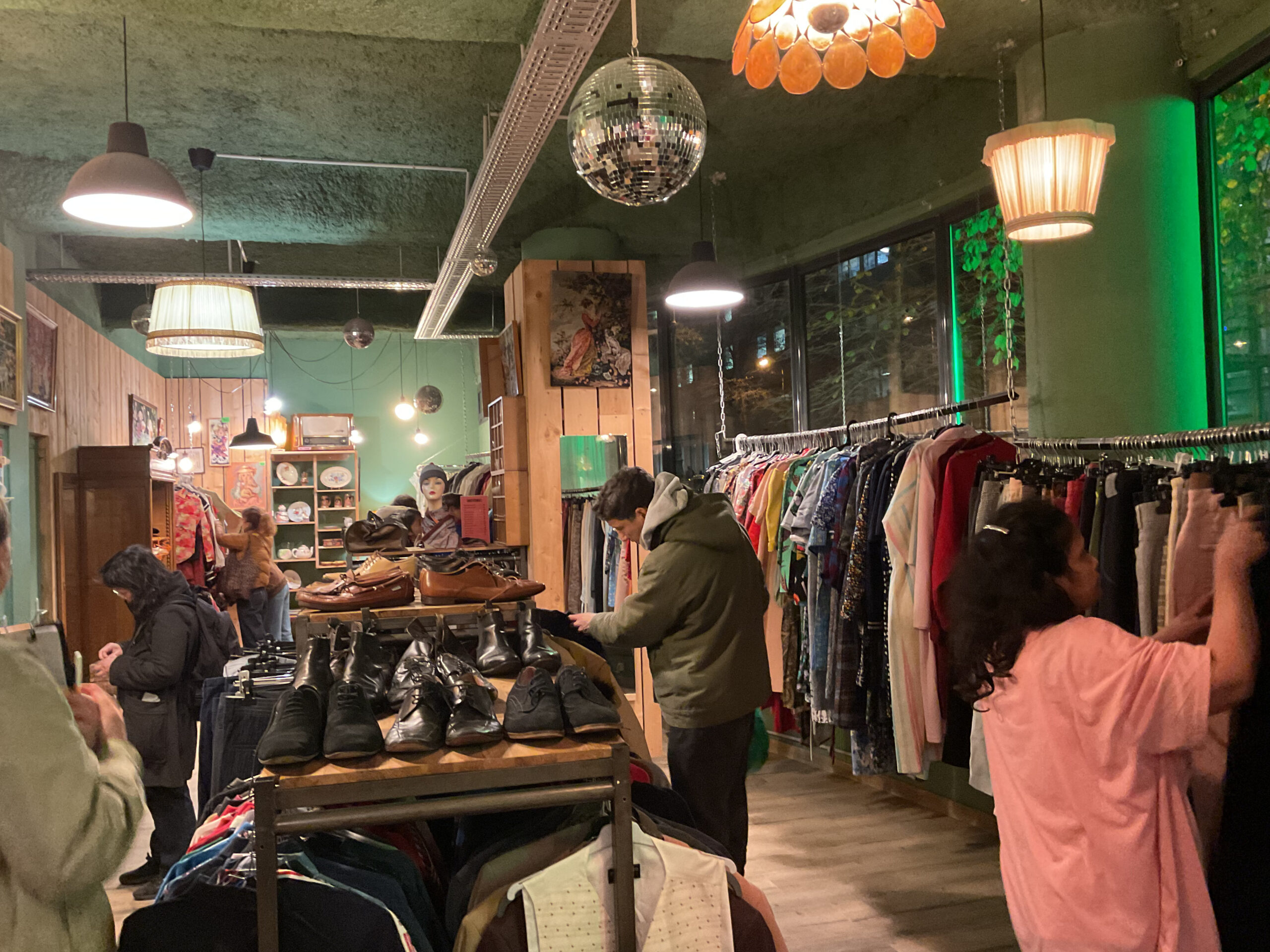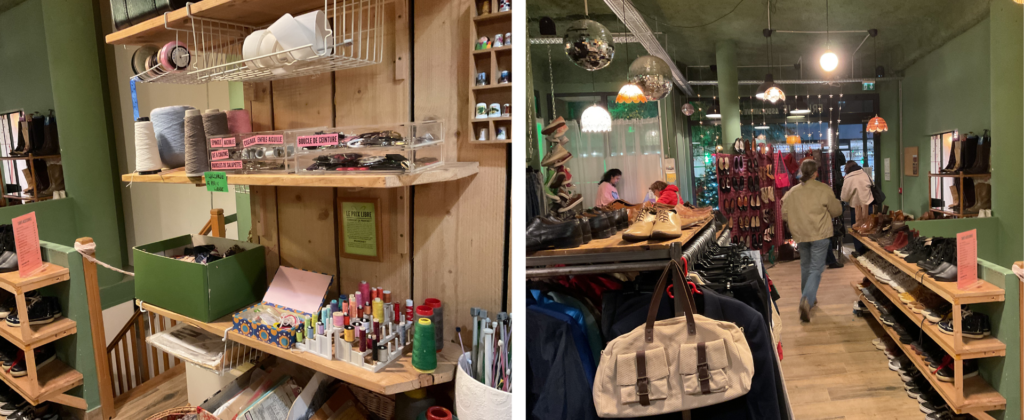 店内には、単なる中古衣料の集合ではなく、ファッションとして「選びたくなる」商品構成やディスプレイが施されていました。フランスにおけるファッション文化の蓄積を感じさせる空間であり、買い物そのものが楽しい体験として設計されていました。写真上の店舗は閑静な住宅街にありますが、19時近くでも人で賑わっていました。写真下のショップでは、回収されたもののうち布地を裁縫用途で小売し、なおかつ修繕の工房で使用出来そうなものは使用しているとのことです。店内の一見バラバラに見えるような照明や什器などもほとんど回収されたもの。それでもお洒落な店舗に編集してしまうところに、フランスのファッションに対する文化の蓄積や底力のようなものを感じました。