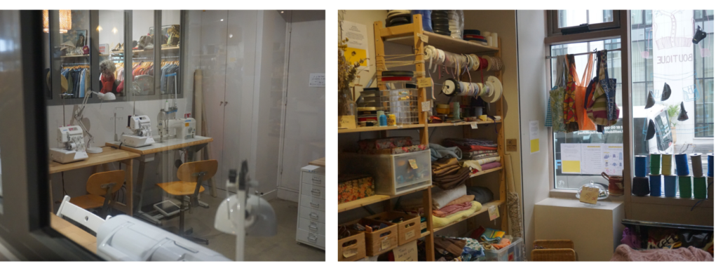 パリでの調査を中心に、その後ミラノに渡航し市場調査を行いました。アパレルの店舗でドアなどにB Corp認証を取得した証を掲げている店舗がいくつか確認されました(写真下)。このような店舗・企業が日本でも増え、それを見て消費者が購買決定をする時代が来ると良いと感じました。また、パリの街中には市民向けに、自身でリペア出来るようミシンの使い方をレクチャーするリペアカフェ(同じく写真下、セカンドハンドショップ併設)が多かったのも印象的でした。このような施設も普及すると良いと感じました。
