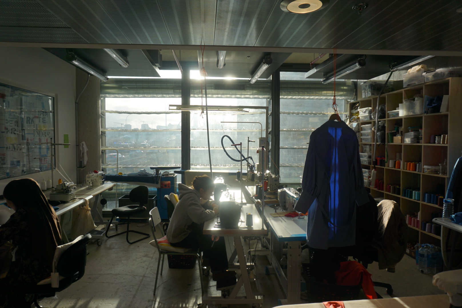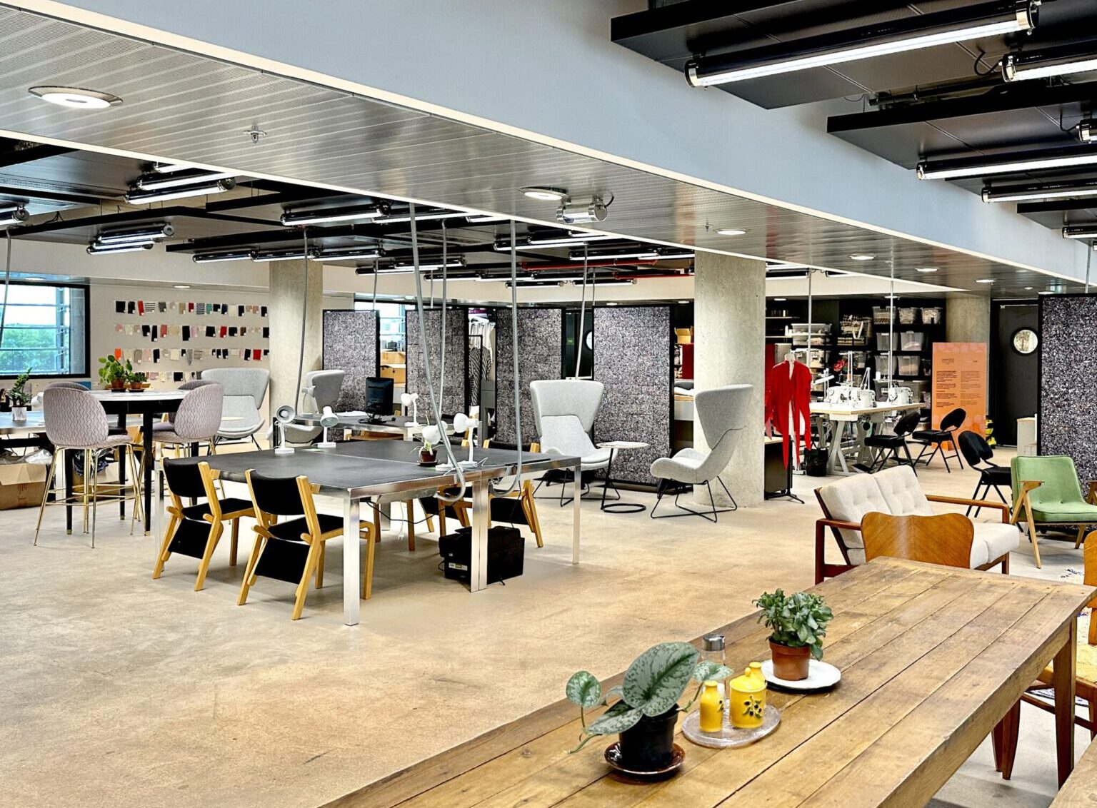 同組織が入居する「Plateau Fertile」は、再開発エリアに位置する比較的新しい建物群の中にあり、建物自体もアップサイクル素材を活用して建設されています。「循環型ファッションを社会に実装する」という理念が、拠点の空間そのものに表れていました。オフィスにある机や椅子もリサイクルで集めてきたもので、グレーのパーテーションは回収した繊維をボードとして生まれ変わらせたものとのこと。かなり頑丈でした。