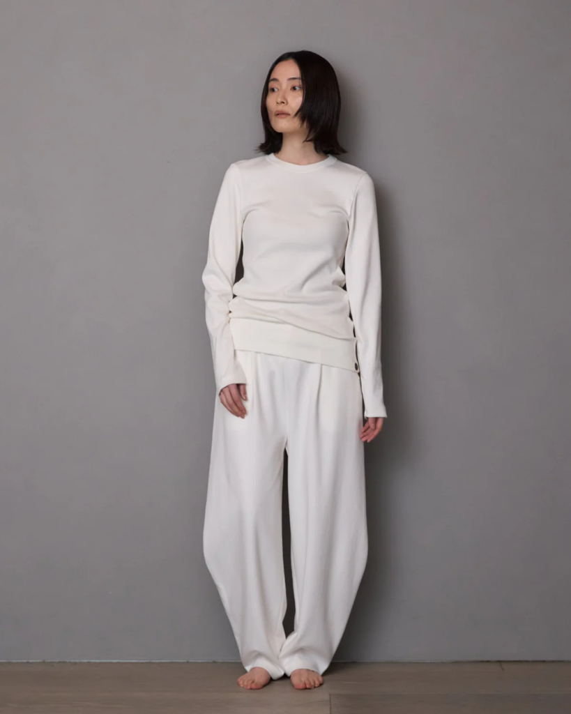 まず驚いたのは、その肌ざわり。とろんとした生地が心地よく身体に寄り添う。そして、無駄を削ぎ落としているのに、どこか奥行きを感じる色彩。デザイナーの岡部さんが「ジャパンモダン」と呼ぶそのデザインは、日本の伝統的な衣服が持つ美しさを、現代の都市生活に馴染むよう洗練させている。