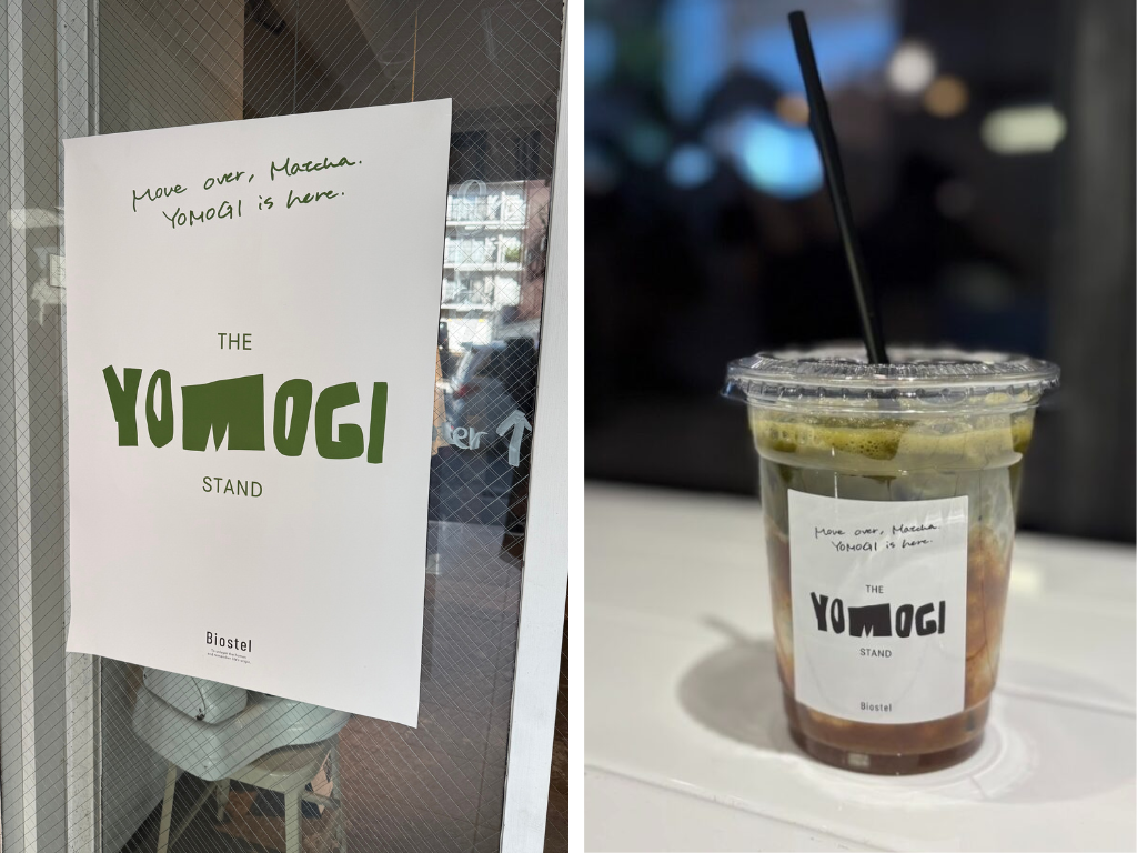 「THE YOMOGI STAND」は、阿蘇で自然栽培され、一つひとつ手摘みされたよもぎを使用する、全国でも珍しい発酵よもぎの専門店だ。提供されるドリンクは、よもぎ本来の力を引き出した発酵エキスをベースにしており、甘味もよもぎそのものが持つものだという。抹茶ブームの次には「よもぎの波」が来ているという話に、わくわくしながら注文を待った。