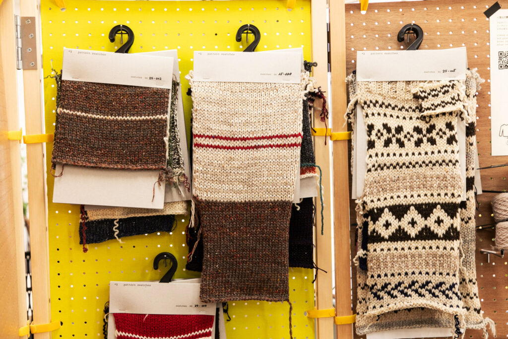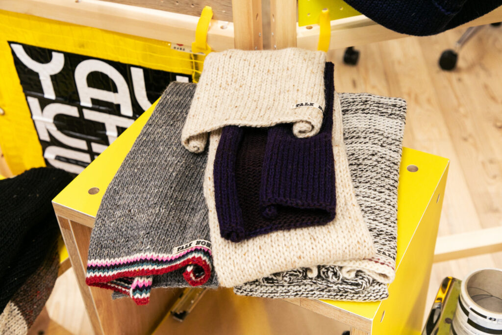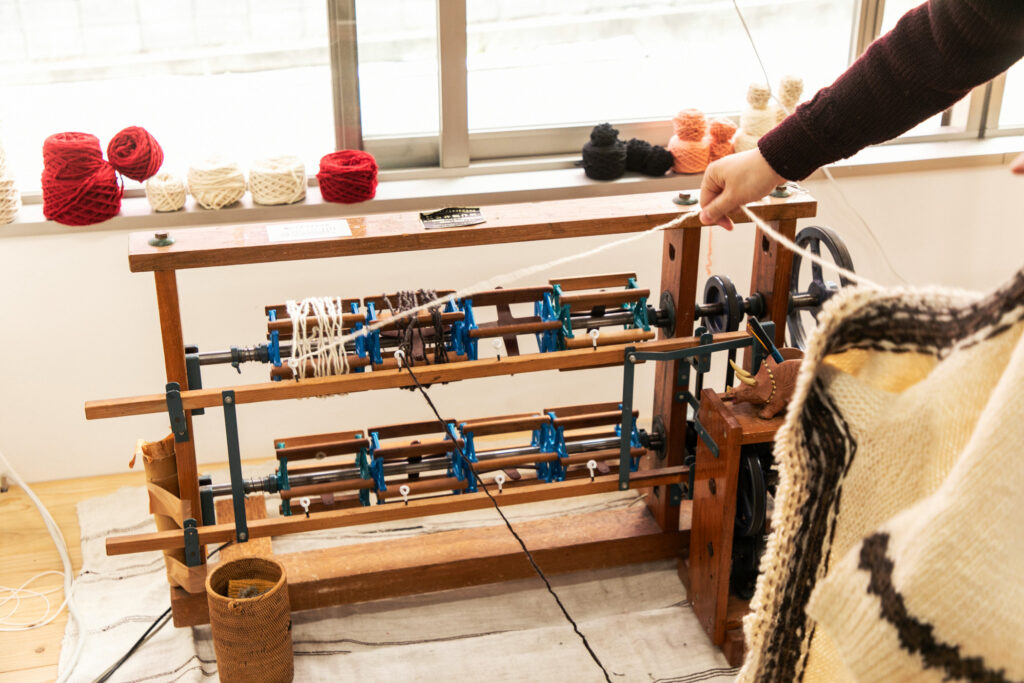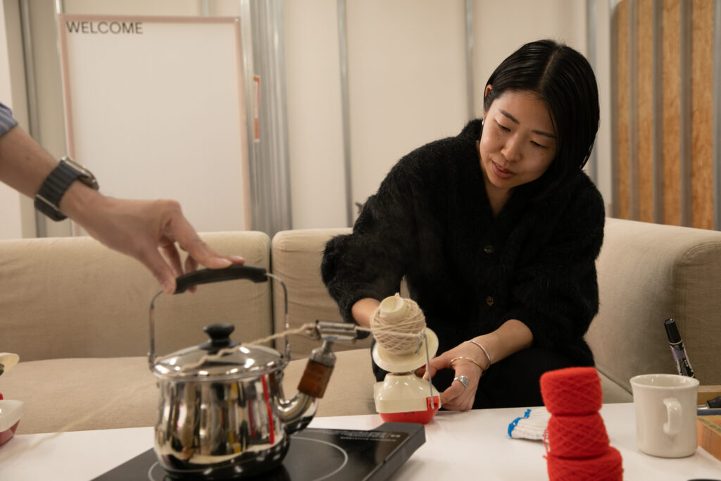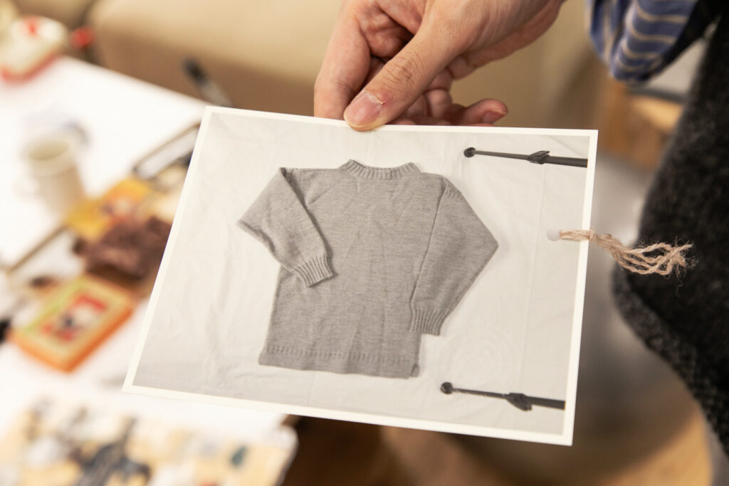 古い道具もいくつか用意しているので、来ていただいた方に実際に作業を体験してもらうことができます。このプロジェクトに関してはプロダクトにまで落とし込めていて、古いニットから取り出した糸と新しい糸を一緒に編む――専門用語で「引き揃え」という作業ですね――それで新しい製品を作っています。その販売もしつつ、来ていただいた方々とお茶でも飲みながらゆっくりお話しして、というようなゆるい雰囲気でやっています(笑)。