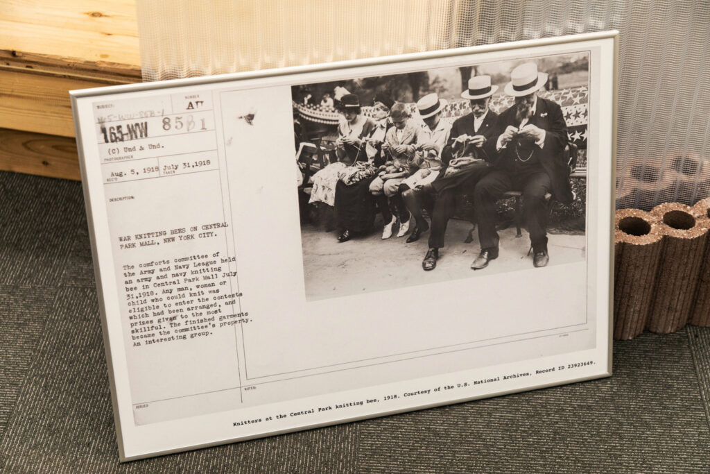 小梶 第一次・第二次世界大戦中、欧米では市民が兵士のために衣服を編んで戦地へ送る「ホームフロント」と呼ばれる活動がありました。展示したのは、その時代の編み図です。市民が一斉に手を動かすという点では、歴史的にも稀に見る出来事ではないかと思います。