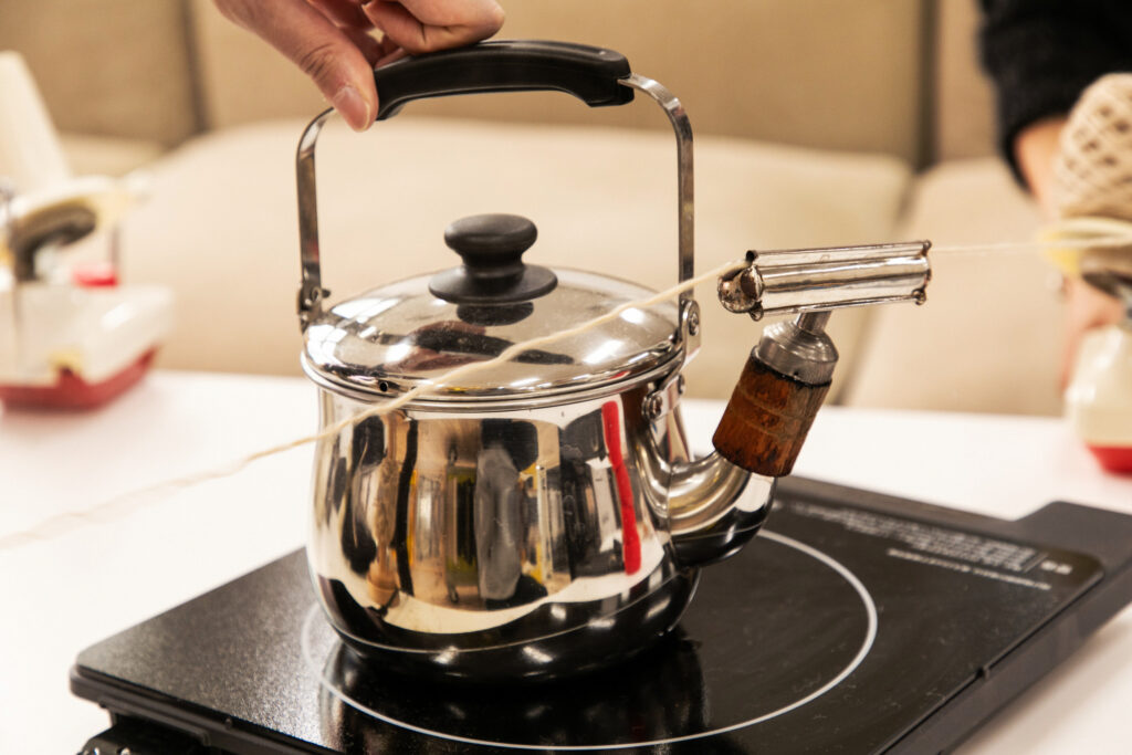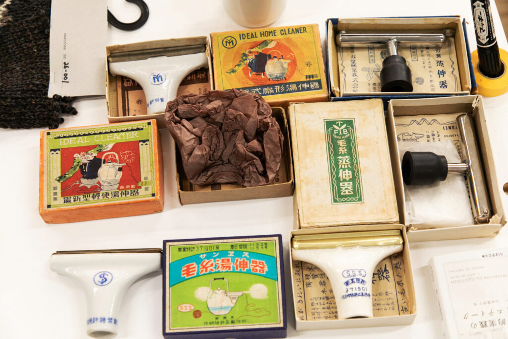 小梶 こちらは昭和に使われていた「湯熨斗器(ゆのしき)」というもので、やかんに装着し、蒸気で解いた糸をまっすぐにする道具です。こういった道具について詳しい方がなかなかいらっしゃらないので、自分たちで調べたり、道具に付属している説明書から学んだりしています。80年代以降は湯熨斗器もスチームアイロンに取り付ける形へと、生活に合わせて変化していっていますね。やかんに直接取り付けるタイプはかなり限られた年代のもので、陶器のほうはおそらく戦前のものだと思います。