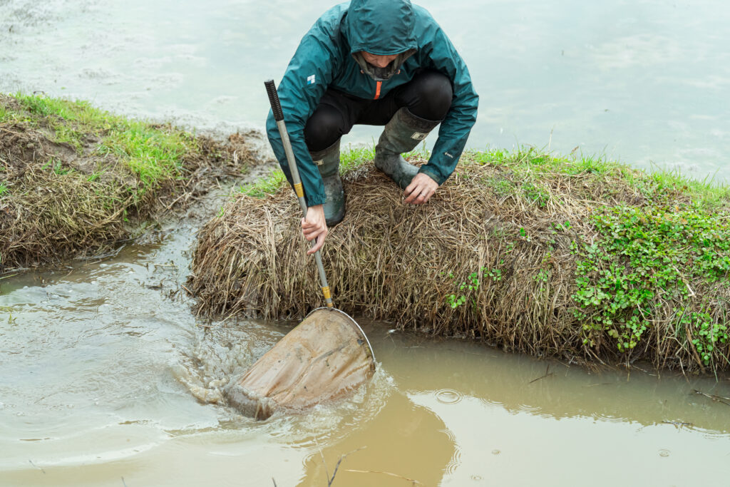 「コウノトリ育む農法」として農薬・化学肥料の削減や不使用に加え、冬期湛水や早期湛水、生き物に配慮した中干しの実施や生物の棲み処となるマルチトープ(水田退避溝)設置などに取り組んでいる平峰さんにとって、自然共生サイトに求められる「生物多様性」の要件はそれほど難しいことではなかったという。しかし、設置したソーラーパネルが水生生物やコウノトリを脅かさず、「生物多様性の保全や再生に貢献しているのか」はエビデンスが求められた。