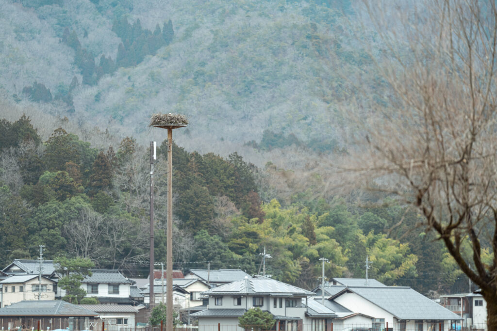 一度は野生絶滅した特別天然記念物のコウノトリを市民の力で蘇らせた、「コウノトリの里」として全国に知られる兵庫県豊岡市。城崎温泉から十数キロ上流にあるエリアでは、田んぼの真ん中に突如背の高い「人工巣棟」が姿を現す。これは赤松の木に巣を作る習性があるコウノトリのために、人が用意したいわば人工の木。山が切り開かれ田畑が造られた「里山」で、コウノトリと人が暮らす共生のシンボルだ。