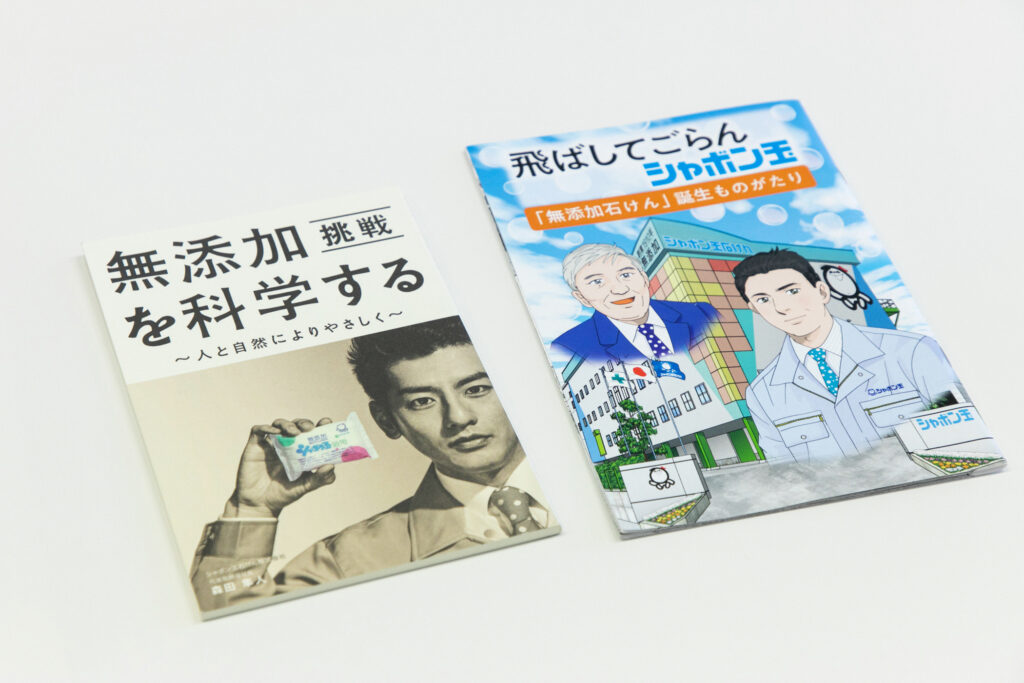 左:創業100周年のタイミングで制作した書籍「無添加を科学する」では、“無添加”と謳っている商品の安全性について深掘りしている。シャボン玉石けんのECサイトで購入可能。右:会社のフィロソフィーなどを漫画で紹介した冊子