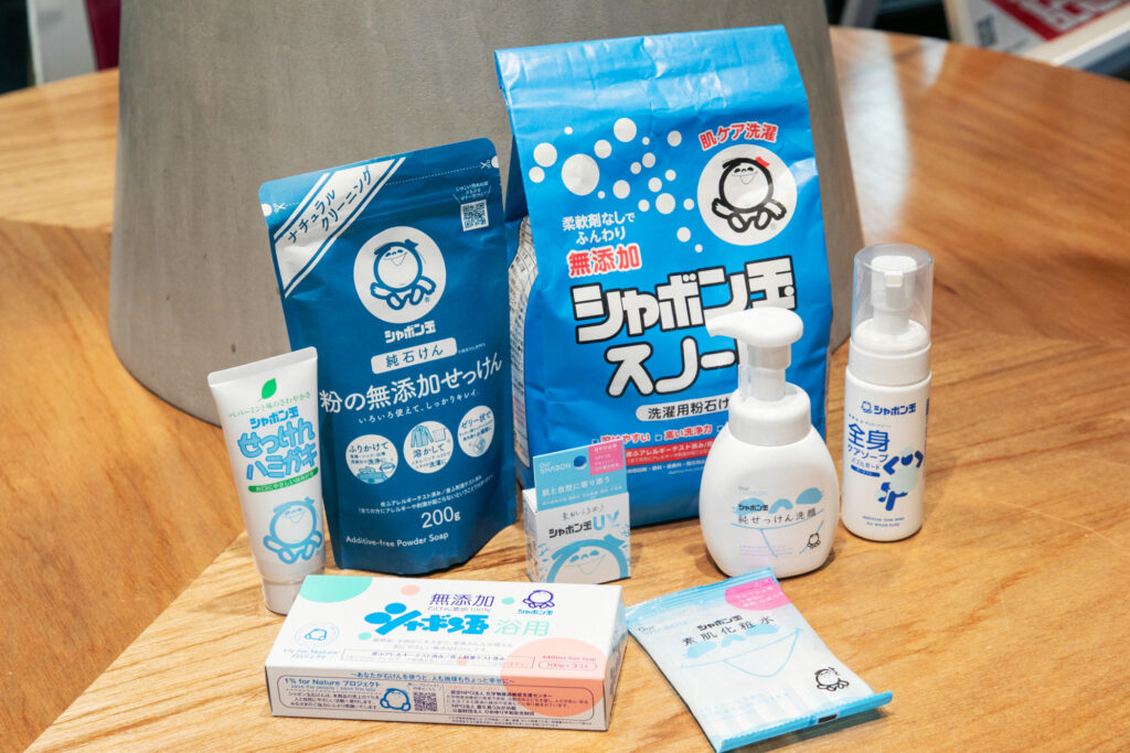 製品は浴用石けんをはじめ、洗濯用せっけん、せっけんハミガキなど多岐にわたります。2025年にはUV、2026年には化粧水とスキンケア製品も販売されました