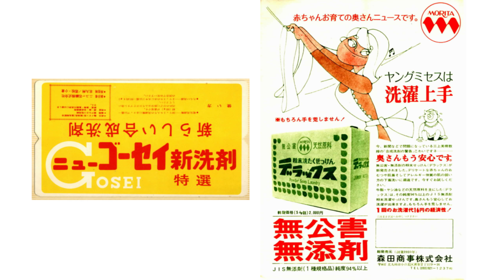 左:合成洗剤のパッケージ。右:無添加石けん一本に切り替えた後のチラシ