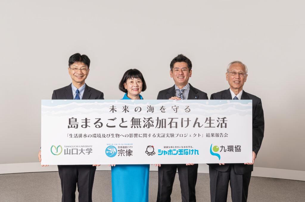 我々と宗像市、山口大学、九州環境管理協会と一緒に行なったもので、2019年9月から11月までの3ヶ月間、島民の皆さんに当社の無添加石けんだけを使ってもらいました。その結果、島周辺から海へ流れ出る排水にどんな変化が出るかを調べたものです。