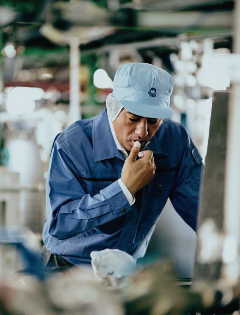 石けんの出来を味見して確認する森田社長。「美味しくはないですけどね(笑)」(森田社長)とのこと