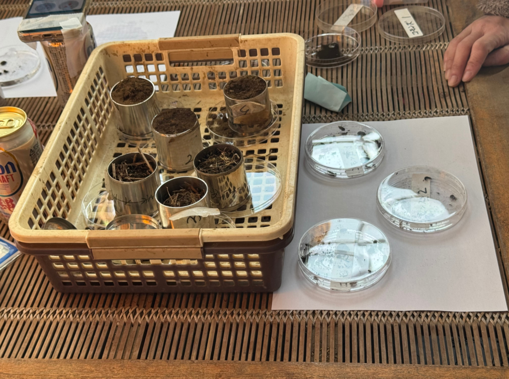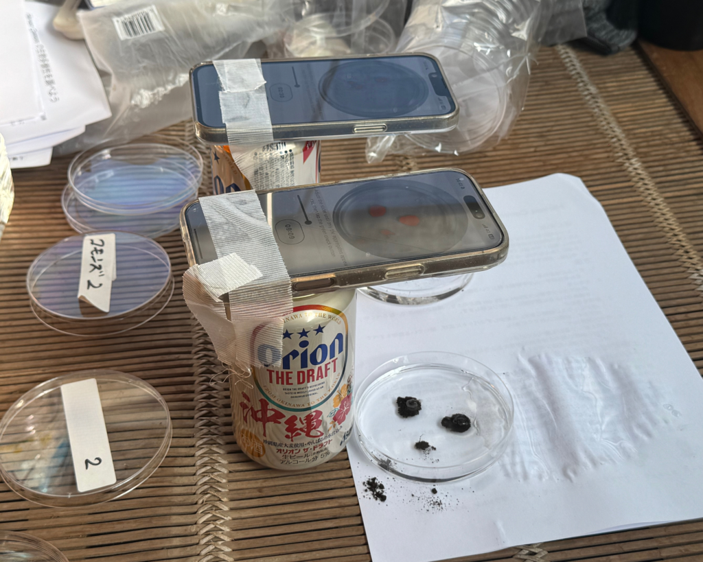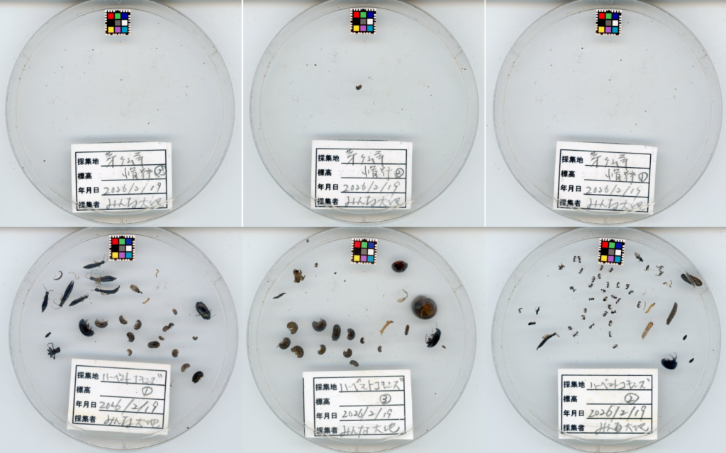 最初は慣行栽培の畑の虫を調査したが、どんなに探しても虫が見つからず、最終的に3カ所の土で1匹だけだった。次にハーベストコモンズの土を調査する。さきほどと打って変わって、次々と虫が見つかり、ダンゴムシ、ミミズ、クモ、ゴミムシ、ハサミムシ、ムカデなど種類も多い。ふたつの畑の距離は徒歩3分の距離なのだが、こんなにも結果が違うことは驚きだった。