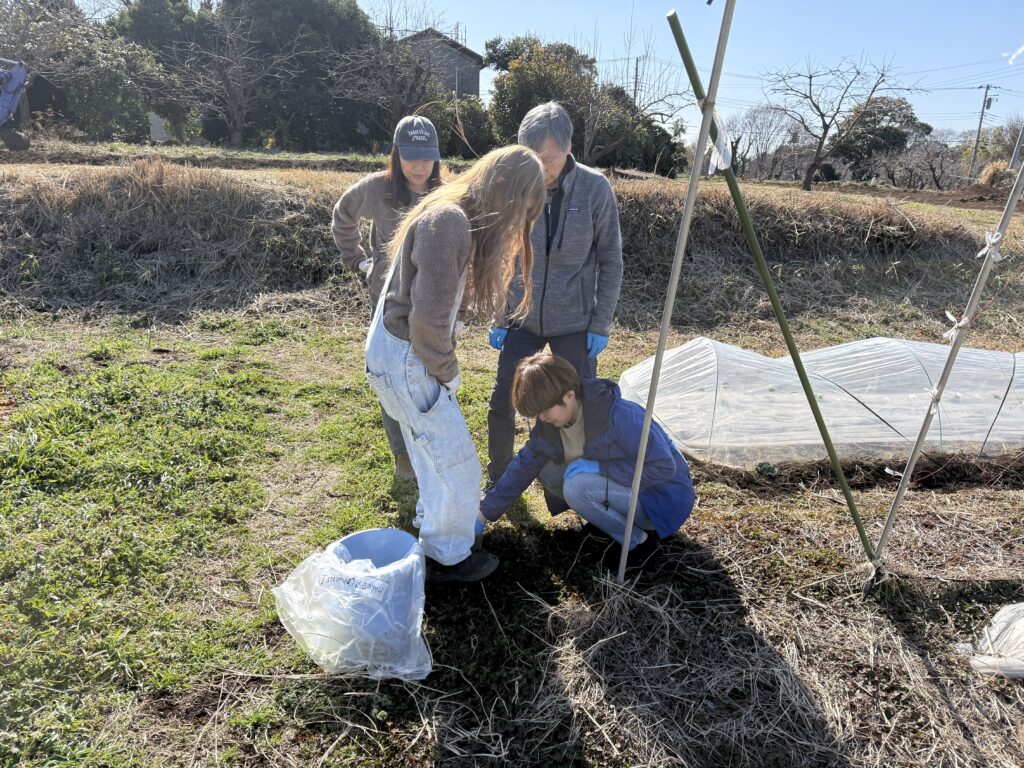 土壌生物調査を実施したのは2月中旬。この季節は、地上の生き物は少ないが、土の中は一年を通して比較的安定しているという。農閑期でもあるため農家への負担も少ない。今回は、不耕起栽培の畑「HARVEST COMMONS(ハーベストコモンズ)」と、すぐ近くにある慣行栽培の農園の土壌を比較する。衣川さん、金子さん、みんな大地スタッフ、コモンズのメンバー9名も加わり、みんなで作業を行った。まずは3班に分かれて、ハーベストコモンズの畑の離れた3カ所から土を採取する。剣先スコップを使い、およそ縦横25cm、深さ20cm分くらいの土を取る。次に慣行栽培の畑でも、同様に3カ所で、同じくらいの分量の土を採取した。